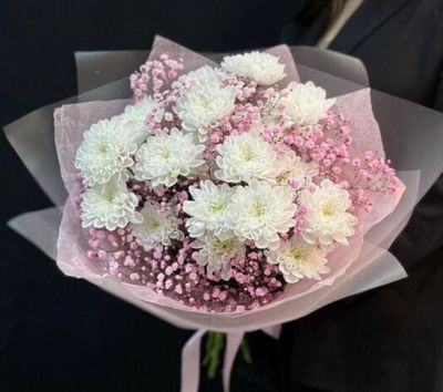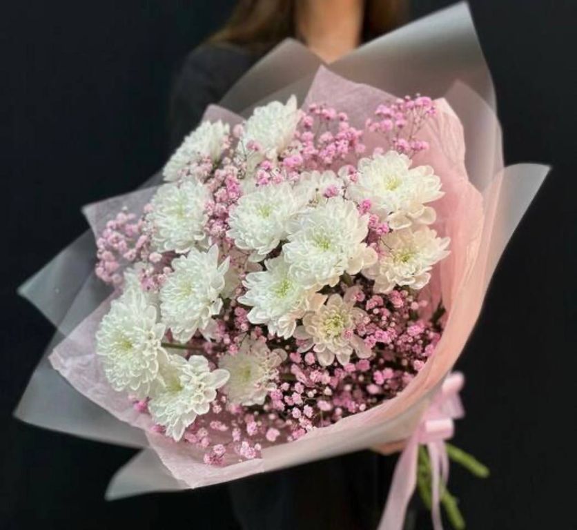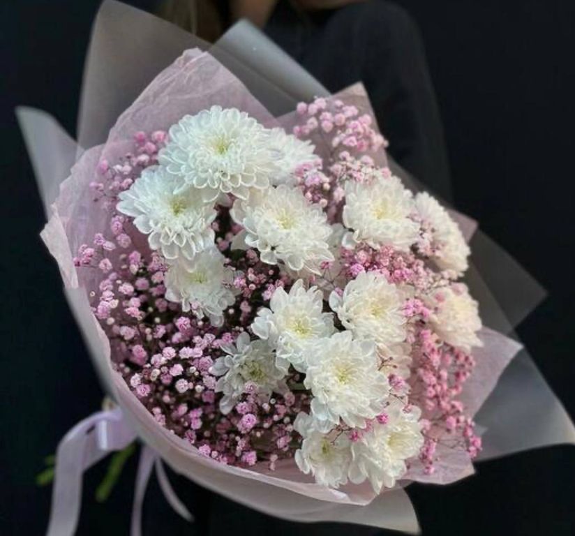 Букет из белой 3 шт хризантемы и розовой 4шт гипсофилы выглядит изысканно и нежно. Белая хризантема символизирует чистоту, стойкость и верность, в то время как розовая гипсофила олицетворяет нежность, доброту и романтичность. Это сочетание цветов создает гармоничный образ, наполненный светом и легкостью, идеально подходящий для свадеб, дней рождения или просто как знак внимания к близкому человеку. Такой букет сможет передать самые искренние чувства и добавить уюта в любой интерьер.